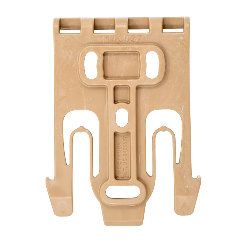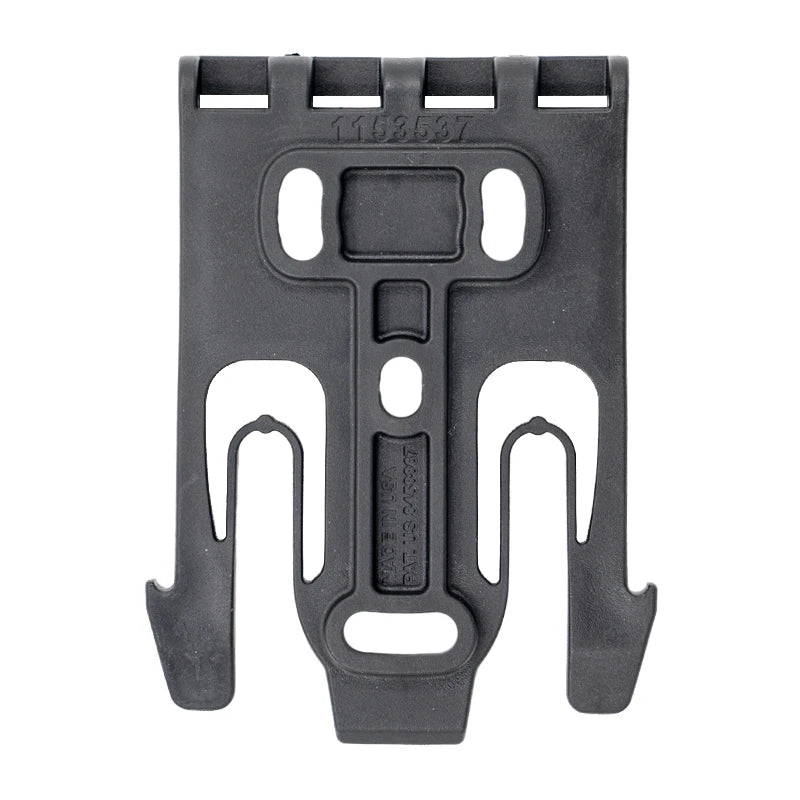 This is the proven MODEL 6004-19 QUICK LOCKING SYSTEM HOLSTER FORK (QLS 19) from Safariland ™. For those that run the full QLS mounting system on their Modular Holster Adaptor, but require swapping out holsters, this is the part you need. Simply attach the QLS fork onto your holster with the factory included hardware, and you are done. The holster-mounted fork portion of the QLS system slides into the QLS receiving plate mounted to your MHA, and self locks once fully pressed down. By adding these QLS forks to multiple holsters, you can switch back and forth to different holsters in meer seconds, without compromising security and retention.